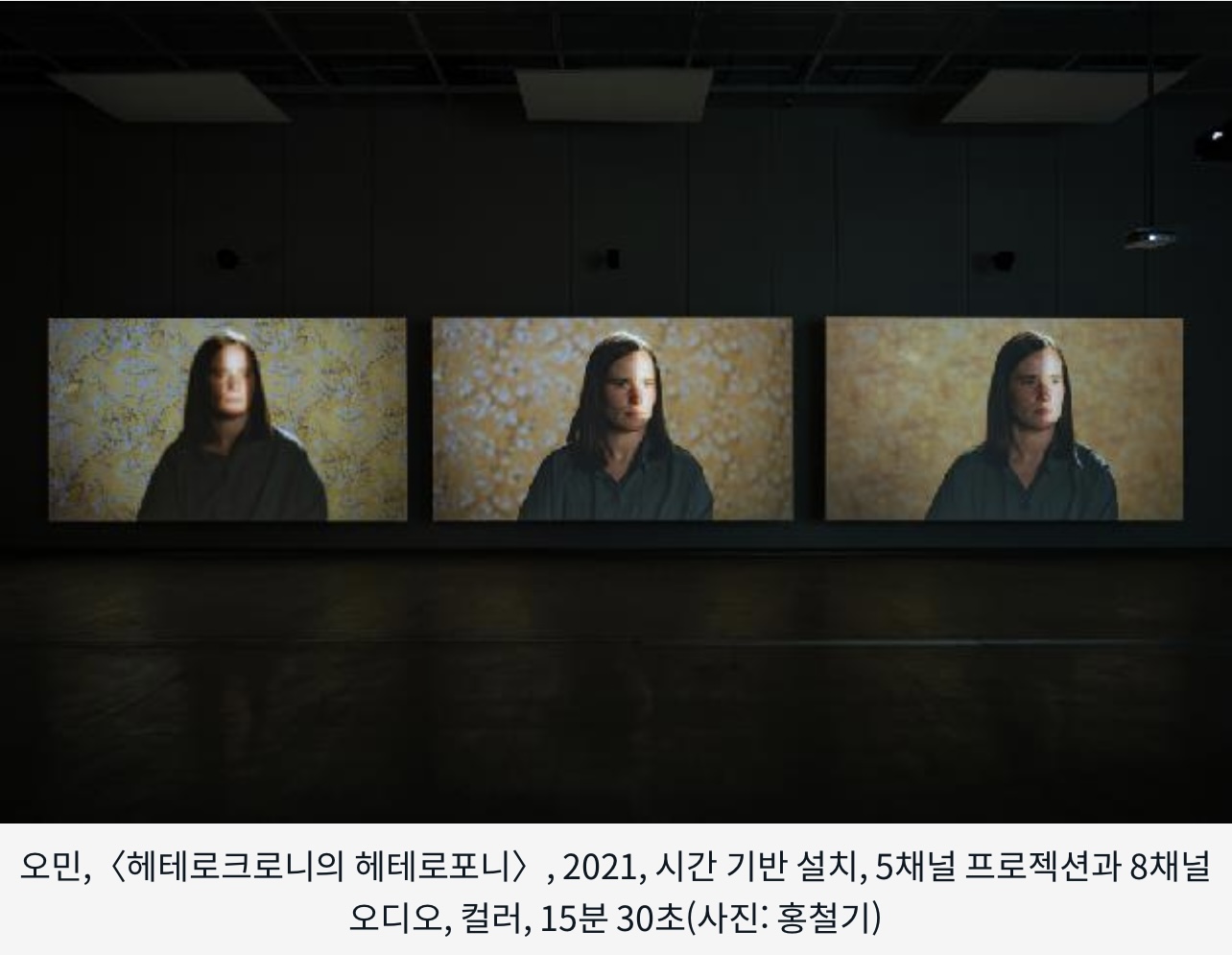 5개의 화면과 사운드 설치 작업으로 구성된다. 이로써 이미지와 소리뿐만 아니라 빛과 신체 그리고 동시적 순간의 공감각적인 경험을 제안한다. 한공간 안에서 여러명이 동시간을 감각하고 사유하며 헤테로포니적 순간을 경험한다.