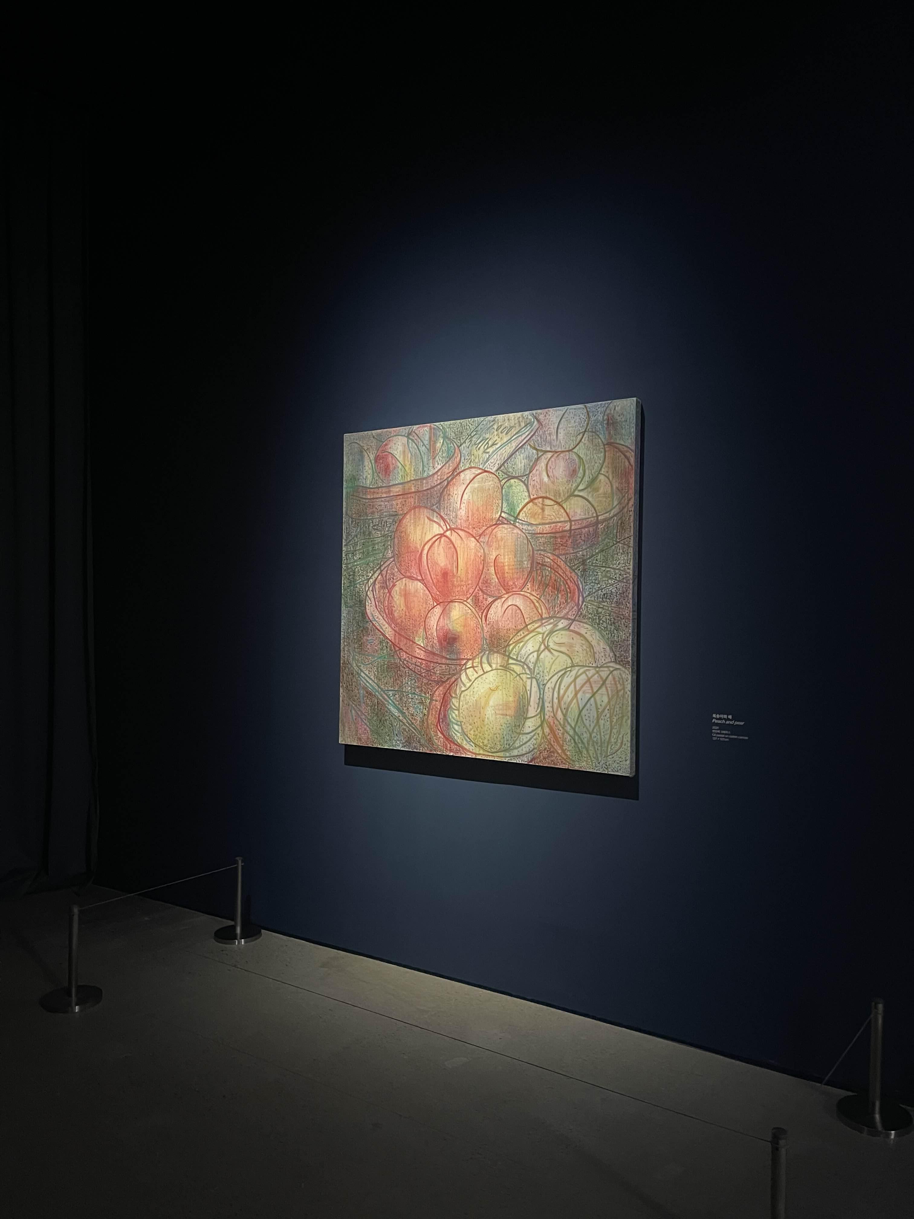 개인적으로 제일 마음에 드는 작품은 구석편에 오로지 하나의 조명을 받고 있는 복숭아 그림 이었습니다. 다른 작품과는 다른 은은한 느낌의 선들이 얽혀 달콤한 복숭아를 표현한 이 작품은 계속 바라보고 있게끔 저를 붙잡았습니다